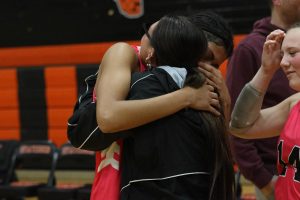 After the final buzzer, senior Addison Wozniak hugs junior Lucy Vanderyden. The girls varsity volleyball team graduated four seniors from the team this year.